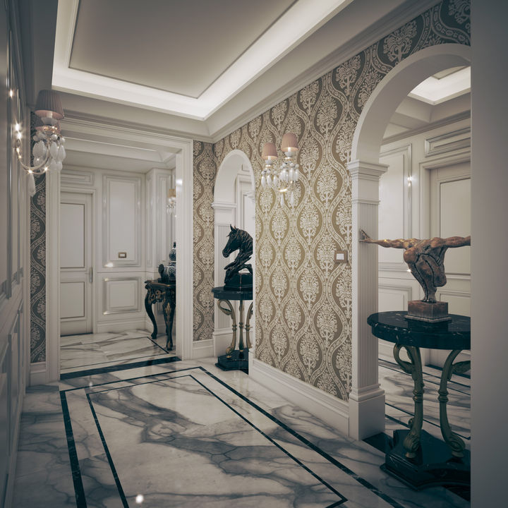 3DStudio + Vray. Il tavolo da pranzo e le sedie sono della Visionnaire, lampadari e applique della Lladro, il mobile console, il mobile in soggiorno, divani e poltrona sono della Modenese gastone, il tavolino in sala è di Silvano Grifoni, il tv è un Samsung curvo da 65"